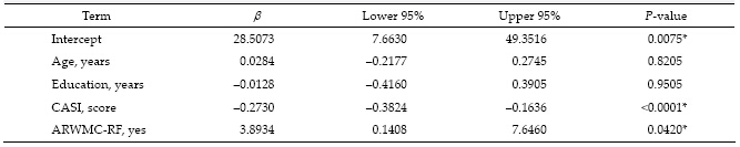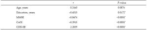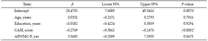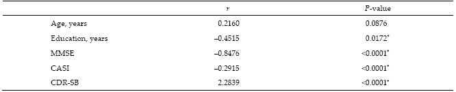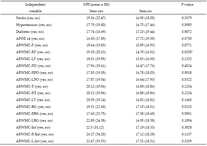 摘要 Objective: The frontal lobe may be involved in circuits associated with depression, apathy, aggression, and other psychiatric symptoms. Although white matter changes (WMC) are related to the severity of behavioral and psychological symptoms of dementia (BPSD) in patients with Alzheimer's disease (AD), it is unclear which part of the WMC may play the most important role in BPSD. This study was designed to investigate the relationship between the location of WMC and the severity of BPSD in AD patients. Methods: Among patients diagnosed with Alzheimer's disease between 2009 and 2014, 387 patients were retrospectively reviewed after those with pre-existing organic brain syndrome, psychiatric diseases, or toxic-metabolic encephalopathy were excluded. Patients' demographic and laboratory data, WMC measured with brain computed tomography and scored using the age-related white matter changes (ARWMC) scale, and neuropsychological tests, including the cognitive abilities screening instrument (CASI), the Mini-Mental State Examination (MMSE), the clinical dementia rating scale with sum-box (CDR-SB), and the neuropsychiatric inventory (NPI) were analyzed. Results: There was no significant difference in the NPI between patients with and without a history of stroke, hypertension, and diabetes. No significant difference in the NPI was identified between different sexes or different Apolipoprotein E (APOE) alleles. The NPI score was significantly correlated with the duration of education (r = -0.4515,P = 0.0172), CASI (r = -0.2915, P < 0.0001), MMSE (r = -0.8476, P < 0.0001), and CDR-SB (r = 2.2839, P < 0.0001). WMC in the right frontal lobe showed a significant difference in NPI in comparison to those without WMC (P = 0.0255). After adjusting for age, duration of education, and CASI, WMC in the right frontal lobe remained significantly associated with the NPI score (β = 3.8934,P = 0.042). Conclusions: WMC involving the right frontal lobe may play an important role in the BPSD in AD patients during their dementia diagnosis. Further studies are necessary to confirm whether controlling the risk factors of WMC can slow the progression of BPSD.