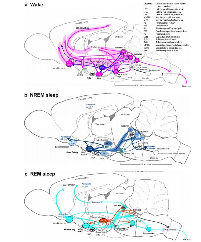20170308103112 Figure 1 Sleep-wake regulation. (a) Wake: The brain stem arousal nuclei (pink) containing ACh, DA, 5-HT, or NA activate the thalamus, hypothalamus, spinal cord motor neurons, and the basal forebrain, and inhibit the VLPA (GABA, galanin); the hypothalamic arousal centers [pink: HA; dark purple: Hcrt] activate the cortex and arousal-related regions in the basal forebrain and brain stem; the thalamus activates the cortex. The glutamatergic MPB in the dorsal pontine tegmentum regulates arousal[28]. (b) NREM sleep: The hypothalamic preoptic area nuclei (dark blue), containing GABA and galanin, inhibit the brain stem and hypothalamic arousal nuclei; the endogenous sleep regulatory substances [adenosine and NO] inhibit basal forebrain arousal nuclei, hypocretin neurons, and TMN neurons; and adenosine activates VLPO neurons. NREM–REM switch: During NREM sleep, serotonergic DR and noradrenergic LC neurons inhibit LDT/PPT neurons. During NREM sleep, vlPAG/LPT neurons inhibit SLD/PC neurons. The GABAergic PZ in the pontomedullary junction promotes sleep[36]. (c) REM sleep: The REM-active brain stem nuclei, including LDT/PPT/SLD/PC and containing ACh, Glu, or GABA, promote activity in the basal forebrain and cortex and induce muscle atonia and rapid eye movements; hypothalamic neurons, containing MCH, promote REM sleep by suppressing REM-inhibitory brain centers, including vlPAG/LPT/DR/LC. NREM–REM switch: During REM sleep, DR/LC neurons become silent, enabling the cholinergic LDT/PPT neurons to generate the hallmarks of REM sleep, including rapid eye movements, EEG activation, and muscle atonia. This reciprocal activity between REM-on (LDT/PPT) and REM-off (DR/LC) neurons drives the cycling between REM and NREM sleep episodes. Additionally, GABAergic neurons participate in the mutual inhibition of REM-activating and REM-suppressing neurons. During REM sleep, SLD/PC neurons use ascending and descending projections to activate the cortex and promote muscle atonia.