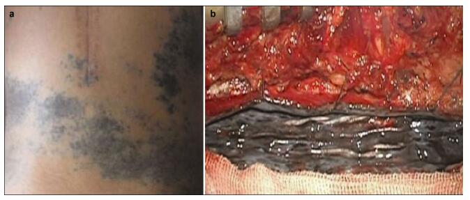 20170308101928 Figure 1 (a) A giant congenital blue nevus in the patient’s back. (b) The spinal cord and cauda equina surrounded by dark black soft tissues.