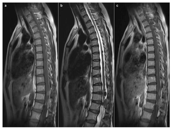 20170308102006 Figure 2 Sagittal magnetic resonance (MR) images. Multi-nodules of T6 through L1, hyperintense on the T1 weighted image (a), hypointense on the T2 weighted image (b), and homogenous enhancement of the lesions and linear enhancement of the spinal pia mater on T1-weighted images (c).
