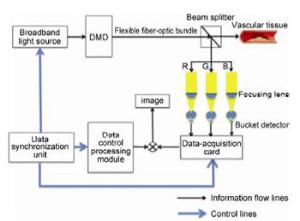 Abstract: Ghost imaging (GI) has characteristics that make it promising for applications in life sciences and other fields,such as its high sensitivity and strong anti-interference compared with traditional imaging.This paper presents a new approach for online angiography using GI.Two signals are correlation-calculated to detect the object image:one of them is the random light field generated by a computer,and the other enters the optical fiber path after being transmitted to the detected object via a modulator.A new approach for the real-time imaging of intravascular flow,vascular wall structures,and components of atherosclerotic plaque is proposed,which has the advantages of a high sensitivity and anti-interference.