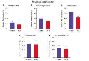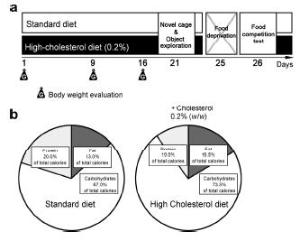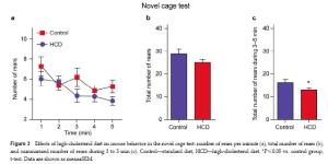 摘要 Objectives: Previous studies involving mice have demonstrated that a cholesterol-enriched diet evokes liver steatosis, dystrophy, inflammation, and aspects of non-alcoholic fatty liver disease (NAFLD). These changes are accompanied by the activation of pro-inflammatory brain and liver molecular pathways, as well as anxiety and depressive-like behaviors. Given previously reported evidence for the neurobiological relationship between the above-mentioned molecular changes and abnormalities in coping with environmental stimuli, such as interactions with other individuals and new environmental contexts, we hypothesized that novelty exploration and aggressive behavior are affected in a mouse NAFLD model. Methods: To test this hypothesis, young female C57BL/6J mice were fed with a regular chow or a diet containing 0.2% cholesterol for 3 weeks. The mice were then assessed for new object and novel cage exploration, and social interaction in a food competition test. Results: We found reduced object exploration in mice on the cholesterol-enriched diet. This reduction was not related to whether the new object was placed in an anxiogenic or non-anxiogenic environment. These changes were accompanied by diminished exploration of the new environment in a novel cage, and delayed approach to food after a period of food deprivation. Mice on the regular chow or cholesterol-enriched diet showed no differences in aggressive behavior towards a counter-partner in a food competition test. Food intake and body weight did not differ between the groups, thus, excluding their potential as confounders in the measured behaviors. Conclusions: We conclude that a diet enriched with cholesterol reduces novelty exploration irrespective of the anxiogenic level of the environment and does not induce aggressive behavior in female mice.