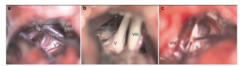 20161117200724  Figure 1 Three group for trigeminal neuragia. (a) The trigeminal nerve was compressed by the artery. (b) The trigeminal nerve without compression needed rhizotomy. (c) The selective lesion was performed on the trigeminal nerve, after decompression. V: the trigeminal nerve; VIII: the auditory nerve.