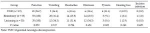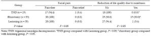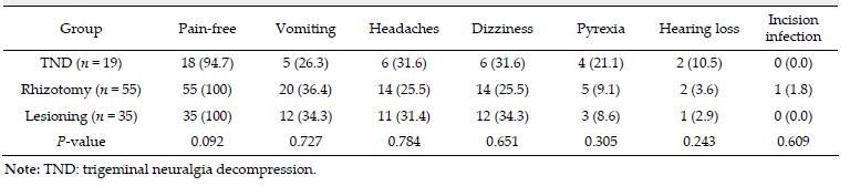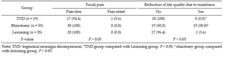 Abstract: Objective: To study the influence of different microsurgical methods on surgical outcomes and complications, and to improve the surgical outcomes for trigeminal neuralgia. Methods: The clinical data of 109 patients with trigeminal neuralgia, who were treated with microsurgery, were analyzed retrospectively. All patients were divided into 3 groups according to surgical modality: the trigeminal neuralgia decompression group (TND group, 19 patients), the TND and rhizotomy group (rhizotomy group, 55 patients), and the TND and selective lesioning group (lesioning group, 35 patients). The mid-term and short-term effects of microsurgery, and the occurrences of complications, were compared between the 3 groups. Results: There were no statistical differences in the frequency of complications between the 3 groups (P>0.05). Eighty-four patients were followed up for 6 to 33 months. The rate of pain disappearance was found to be 94.4% in the TND group, and 100% in both the rhizotomy and lesioning groups; thus, no significant differences were found between these 3 groups (P>0.05). Additionally, 50% of the patients in the rhizotomy group and 3.6% of the patients in the lesioning group had facial numbness while no patients were affected with facial numbness in the TND group, and the differences between these 3 groups were significant (P<0.05). Conclusions: Microsurgery is effective and safe for trigeminal neuralgia. The use of TND, in combination with selective lesioning, ensures therapeutic efficacy and improves the quality of life in postoperative patients.