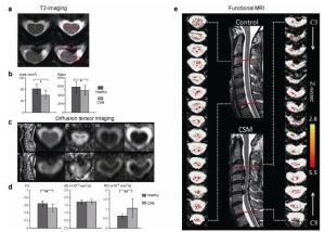 20170308095407 Figure 1 a-e A combination of magnetic resonance imaging (MRI) techniques. Diffusion tensor imaging (DTI) and corresponding T2-weighted structural measurements provided sufficient structural and functional information in a patient with cervical myelopathy. T2-weighted images showed a morphometric change with stenosis. DTI showed decreased fractional anisotropy (FA) and increased radial diffusivities (RD), indicating demyelination in the white matter. In functional MRI, the blood oxygen level-dependent signal change in a patient with cervical myelopathy was significantly higher than that in a healthy subject (*p < 0.05 **p < 0.01).