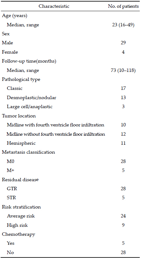 3 Results 3.1 Patient and tumor characteristics Between January 2004 and January 2007, 53 patients older than 16 years underwent tumor removal at Beijing Tiantan Hospital. Two patients did not receive radiotherapy or chemotherapy. One tumor was located in the occipital lobe and was not diagnosed as medulloblastoma. Seventeen patients were lost to follow-up. Ultimately, a total of 33 patients were included in our cohort (Table 1). The median age at surgery was 23 years (range, 16–49 years). Four patients were women (12.1%). Twenty-two tumors were located at the midline, and 11, in the cerebellar hemisphere. According to surgical reports, 12 of 22 midline tumors were found to have infiltrated the floor of the fourth ventricle.All 33 pathological slides were reviewed again. Seventeen patients had the classic subtype, 13 had DNMB, and 3 had LC/A medulloblastoma. None of the tumors were classifiable as MBEN.