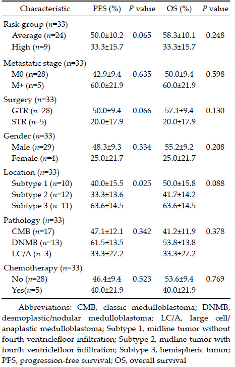 Results: The median follow-up period was 73 months. The 5-year progression-free survival (PFS) and overall survival (OS) rates were 45.5%±8.7% and 51.5%±8.7%, respectively. Recurrence or progression was observed in 21 patients, and 14 patients were still alive. Tumor location at the midline with infiltration to the floor of the fourth ventricle was associated with the worst PFS and OS (P= 0.032). Hemispheric desmoplastic/nodular medulloblastomas (DNMBs) were associated with a better outcome than midline DNMB. The average-risk group tended to have a better 5-year PFS rate than the high-risk group (P= 0.065).