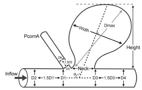 2 Materials and methods The Institution Review Board of the Second Military Medical University affiliated Changhai Hospital approved this retrospective study. The informed consent requirement was waived. 2.1 Patients and baseline characteristics Based on three‐dimensional digital subtraction angiography (3D‐DSA),89 cases of PcomA aneurysms from 81 consecutive patients who were diagnosed in our hospital from January 2012 to December 2013,were included in this study. Fifty‐eight aneurysms ruptured and presented with subarachnoid hemorrhage (SAH) while 31 cases remained unruptured. The rupture statuses of multiple aneurysms in patients with SAH were determined either from the hemorrhage patterns on computerized tomography (CT) scans or from intraoperative findings. The baseline characteristics were collected based on age and gender,as well as the presence of hypertension,current smoking,a history of familial SAH,homolateral oculomotor nerve palsy,fetal PcomA type,and multiple aneurysms. Hypertension was defined as a systolic blood pressure of ≥140 mm Hg,or a diastolic blood pressure of ≥90 mm Hg before the onset of SAH. A fetal‐type of PcomA was defined as the presence of an aneurysm with similar or larger caliber as the P2 segment of the posterior cerebral artery and is associated with an atrophic P1 segment. 2.2 Imaging acquisition and morphological parameters Three‐dimensional DSA was performed using the Artis zee Biplane angiographic system (Siemens,VC14, Germany). We adopted the 5s DSA acquisition protocol and a total of 18 mL of contrast agent was injected through the internal carotid artery at the rate of 3mL/s with a 1 second x‐ray delay. During the 5 seconds of acquisition,a 200‐degree rotation of the C‐arm was performed to obtain 133 frames. The 3D internal carotid artery vessel tree was automatically reconstructed at the syngo X Workplace (Siemens,VB15,Germany) and then exported in the stereolithography (STL) format. The GEOMAGIC STUDIO 9.0 software (Geomagic, Morrisville,North Carolina) was used for preparing the vessel structure for CFD simulation. The neck plane was defined as the location of the outward protrusion of the aneurysmal sac from the parent vessel. The 3D‐vessel was subdivided into the aneurysm,as well as the inlet and outlet planes of the parent artery,and subsequently exported in STL formats. These formats were imported into the Matlab 7.0 (The MathWorks, Inc.,Natick,MA,USA) software for visualization and calculation of the morphological parameters.In this study,seven morphological parameters,including size of the aneurysm dome,aspect ratio (AR), size ratio (SR),dome‐to‐neck ratio (D/N),bottle‐neck factor (BN) and inflow angle,were measured and calculated as previously reported[6, 10] (Figure 1).