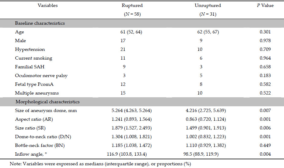 Methods: In 89 PcomA aneurysms (58 ruptured, 31 unruptured), clinical and morphological characteristics were compared between the ruptured and unruptured groups. Multivariate logistic regression analysis was performed to determine the independent predictors for the rupture status of PcomA aneurysms.