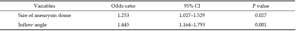 4.1 Limitations The study has several limitations including the small sample size,which is a major limitation in this retrospective study. Additionally,the morphology of PcomA aneurysms might change after rupture and affect the accuracy of measurements. Finally,the logistic regression model was developed only for PcomA aneurysms,and cannot be applied to aneurysms at other anatomic locations. 5 Conclusions Morphological characteristics are involved in the risk of rupture of PcomA aneurysms. The size of the aneurysm dome and inflow angle are independent predictors of the risk rupture of PcomA aneurysms. Acknowledgments This work was supported by the Key Project of Shanghai Science and Technology Committee (No. 13411950300),the National Natural Science Foundation of China (No. 81301004),the Key Project of Shanghai Municipal Health Bureau (No. 2013ZYJB007) and the 1255 Project of Changhai Hospital (No. CH125550400). We gratefully acknowledge the Shanghai Supercomputer Center for providing the mathematical soft wares that were used in this study. Conflict of interests The authors have no financial interest to disclose regarding the article. Author Contributions Conceived and designed the experiments: NL,QH. Performed the experiments: NL,YF,YY. Analyzed the data: JX JL. Wrote the paper: NL,QH.| [1] | Korja M, Lehto H, Juvela S. Lifelong rupture risk of intracranial aneurysms depends on risk factors:A prospective Finnish cohort study. Stroke , 2014, 45(7):1958-1963. |