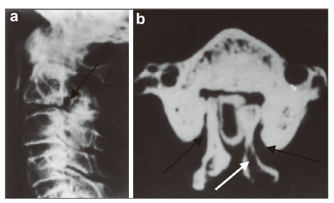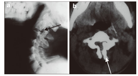 | Figure 2 A 26‐year‐old man presented with bilateral C3 spondylolysis. (a) Lateral view plain radiography showing a hypoplastic articular mass and spinal process at C2(black arrow).(b) Iodine contrast CT showing bilateral clefts between the articular pillar and the facets of C3 as well as spina bifida (white arrow). |