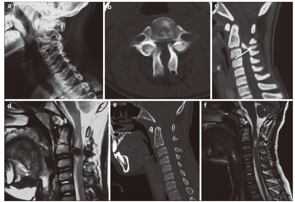 | Figure 3 A 14‐year‐old boy presented with bilateral C3 spondylolysis.(a) Oblique view plain radiography showing a cleft of the articular pillar (arrow).(b) On axial CT,the lateral mass at C3 was discontinuous,with typical features of spina bifida (arrow).(c,d) A bony density (white arrow) and low cord signal (black arrow) change was observed at the spondylolytic level.(e,f) Follow‐up CT showed the bony density had disappeared and MRI showed a slightly high cord signal (arrow). |