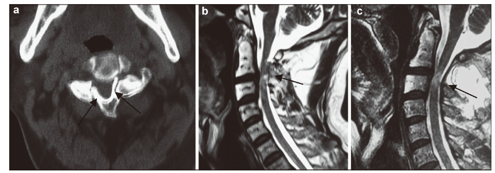 | Figure 4 A 45-year-old man presented with bilateral C3 spondylolysis.(a) Axial CT scan revealed well‐corticated clefts between the bilateral C3 facets (arrows).(b) On sagittial MRI,the canal at the spondylolytic level was narrow and the subarachnoid space disappeared (arrow).(c) Follow‐up MRI showed the subarachnoid space was clear (arrow). |