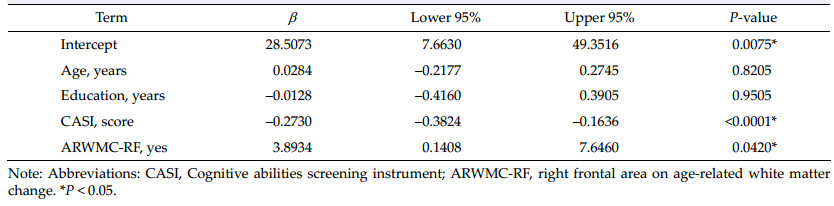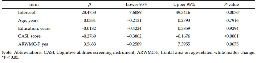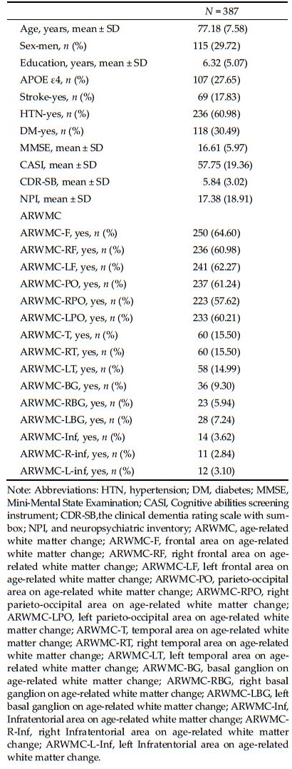 2.4 Statistical analysis Statistical analyses were performed using JMP Soft‐ ware,Version 9 (SAS Institute Inc,Cary,NC,USA). Continuous data were analyzed using the Student’s t test and simple linear regression. All variables with p < 0.1 in a univariate analysis were entered into the forced entry model of the multiple linear regression analysis. Diagnosis of collinearity was performed,and no collinearity was identified. The entered variables are presented with their standardized coefficient (β), 95% confidence interval (95% CI),and p value after adjustment for other confounding variables. A p value < 0.05 was considered statistically significant. 3 Results Of 870 patients with Alzheimer’s disease,420 patients fulfilling the inclusion criteria were enrolled in this study. Based on a chart review,387 patients were eligible for further analysis. 3.1 Baseline data Table 1 shows the baseline demographic characteristics and the ARWMC scales of all AD patients. The 387 AD patients included 115 men (29.72%) and 272 women (70.28%). The meanage (± SD) was 77.18 ± 7.58 years. The mean CASI,MMSE,CDR‐SB,and NPI (± SD) were 57.75 ± 19.36,16.61 ± 5.97,5.84 ± 3.02,and 17.38 ± 18.91, respectively. There were 69 (17.83%) patients with a history of stroke,236 (60.98%) patients with a history of hypertension,and 118 (30.49%) patients with a history of diabetes.![]() |