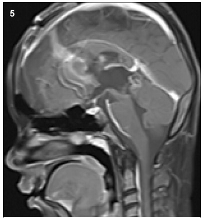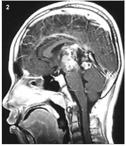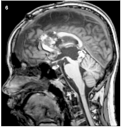 As a result of the large tumor compressing the midbrain,the boy was somnolent,unable to walk,and