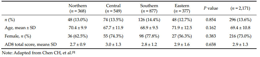 Recently,there were two studies addressing the current prevalence of dementia in Taiwan[2, 3]. A study using the ascertainment of dementia 8 (AD8) as a screening tool to screen individuals aged greater than 50 years old has found that the estimated prevalence of very mild dementia could be higher than before. That study was completed by the extensive coverage of the mentality protection center (MPC),Fo Guangshan, Taiwan,and the volunteers of MPC conducted medicine‐related services and screening of dementia by using the AD8 that can detect dementia even at its very mild stage in the general population throughout Taiwan. From 2011 to 2013,in total,2,171 participants, 368 in the northern,549 in the central,877 in the southern,and 377 in the eastern part,were recruited with the mean age being 66.9 ± 10.2 years. The ratio of patients with suspected dementia with an AD8 score ?2 was 13.6% for all recruited participants, with their mean AD8 score being 2.9 ± 1.3,mean age being 69.4 ± 10.8 years,and female predominance being 73.0% (Table 1). Although this is a screening study,it has extensive coverage of Taiwan. The AD8 is capable of screening very mild dementia and the results have provided updated information on early stage dementia in Taiwan[3].