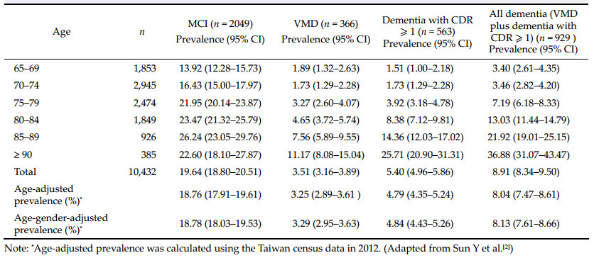 Another recently published study has suggested the prevalence rates closer to those seen in Europe and the US. A meta‐analysis based on DSM‐IV estimated the prevalence of dementia in adults aged 65 years or more to be 5.7% (95% CI 3.2-8.2)[4]. The whole area survey in 2014 estimated the prevalence of all‐cause dementia at 8.04% (95% CI 7.47-8.61),including a 3.25% (95% CI 2.89-3.61) prevalence of very mild dementia (VMD). Meanwhile,the study estimated the prevalence of mild cognitive impairment (MCI) at 18.76% (95% CI 17.91-19.61) (Table 2).