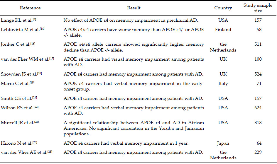 2 Effect of racial differences in APOE on cognitive outcomeAD risk factors have not been thoroughly studied in different ethnicities and populations. There is evidence that these risk factors may vary considerably among ethnic groups. Table 1 summarizes the results of APOE ε4‐related studies examining different racial populations[29]. Studies in Finland[14],the Netherlands[16], United Kingdom[17, 18],and Italy[19] have found APOE ε4 to be associated with cognitive decline. The APOE ε4 allele is especially common among people of European ancestry[20]. Several studies from the United States have reported similar conclusions[8, 15, 21, 22]. More specifically,The APOE ε4 allele is also common among people of African ancestry[23]. Some studies suggest that APOE ε4 has a weaker relationship with cognitive decline in this population[23],whereas other studies have suggested the opposite[24, 25]. Table 1 show that a lower number of studies were conducted in Asia. In Japan,population‐based studies of white and Japanese populations have found that the APOE ε4/ε4 genotype is associated with a significantly increased risk of AD[26]. Few studies have investigated this relationship in the population of China.