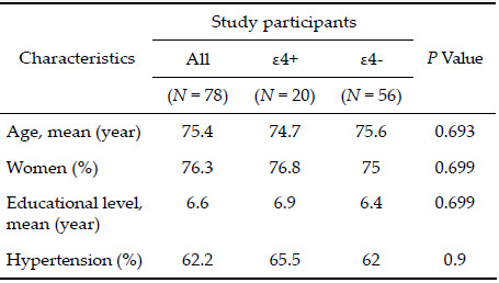 In 2015,Yang et al. published the first analysis of the relationship between the APOE ε4 genotype and treatment responses in the patients with AD in Taiwan, reporting that APOE ε4‐positive (i.e.,having at least one APOE ε4 allele) patients with AD exhibited more rapid functional decline despite treatment[27]. However, this study had some limitations,including a relatively small sample size. Our study expanded these findings. In order to have a more clear understanding of the association of the therapeutic response and APOE ε4 genotype,we have analyzed 78 more patients with AD in Taiwan of whom 26.3% had the APOE ε4‐positive gene,by using one‐way ANOVA (Table 2) and controlling other possible variables[27]. The average age of patients was 75.4 years. The APOE ε4 gene carriers were younger than non‐carriers and had a higher education level (Table 2). Of these 78 patients,62.2% had hypertension. No significant difference in cognitive resilience was observed between patients with differing APOE ε4 status,age,sex,education level,or hypertension status.