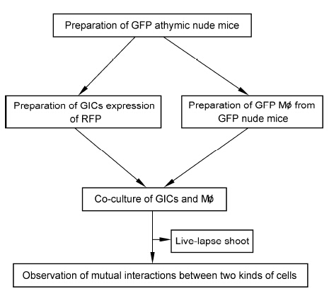 2.2 GIC cell lineLentiviral vectors (Genechem Chemical Technology Co.,Ltd.,Shanghai,China) were used to transfect the red fluorescence protein (RFP) gene into human SU3 GICs as previously reported[3]. A total of 1 ´ 106 SU3 RFP cells were injected directly into the abdominal cavity of 6-week-old NC C57BL/6J GFP athymic nude mice,tumors formed over approxiamtely 4 weeks.