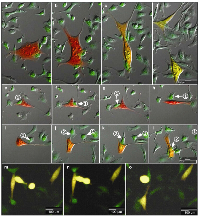 | Figure 3 Cell fusion between GICs and Mø. (a–d) GIC actively fused with Mø. A GIC cell extended its pseudopodia to attack several Mø (a). Next, some Mø were fused successfully by the GICs (b), after which another GIC completely fused with Mø and became an RFP/GFP double positive fusion cell. The cell body of the fusion cell gradually became prolonged with a tapered middle section (c). Next, the cell entered prophase of mitosis. Approximately 17 h were required for the cell to divide into two offspring cells (d). (e–l) Mø actively fused GIC. Initially a GIC was enclosed by several Mø (e), and then the Mø (including No. ① cell) further approached and attacked the GIC continuously. It appeared that the cells could not find a breakthrough point, so the No. ① cell changed its attack point (f). After 1,870 min of “fighting”, the shape of Mø (No. ①) changed and had more filamentous pseudopodium and did not maintain close to inserted into the GIC directly (j). Next, the GIC changed from red to light yellow, and several Mø entered the GIC individually, causing the GIC to become dark yellow. Both the RFP and GFP markers were positive (l). (m–o) Re-fusion occurred between the GIC-Mø fusion cells. There were 4 yellow cells in the vision field. The two round cells fused together. Initially, one cell rapidly approached another cell (m). The cells came into contact and began to combine (n). This fusion process took approximately 60 min and the fusion cells were 2× larger than the size of the parent cell (o). |