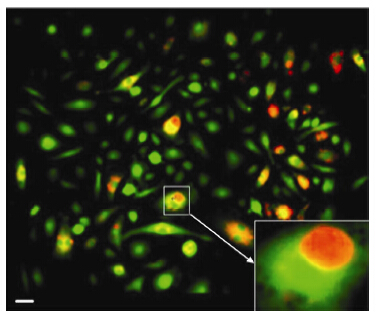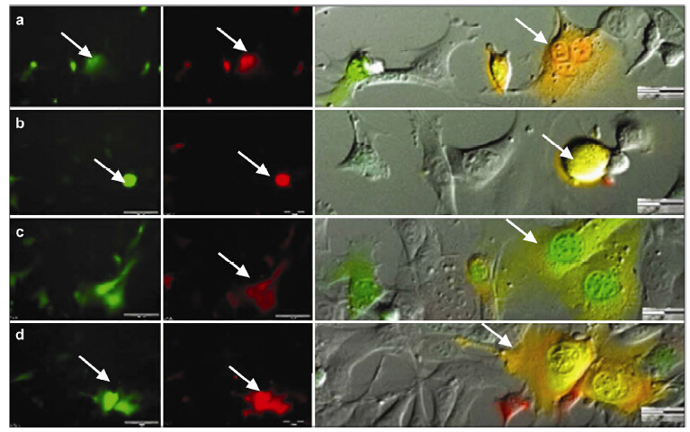 3.3 Outcomes of fusion cellThe fate of the fused cells showed two opposite outcomes: reproduction and apoptosis. The former was dominant,occuring in 91.4% of the cases,and apoptosis occured in 8.6% of cases.