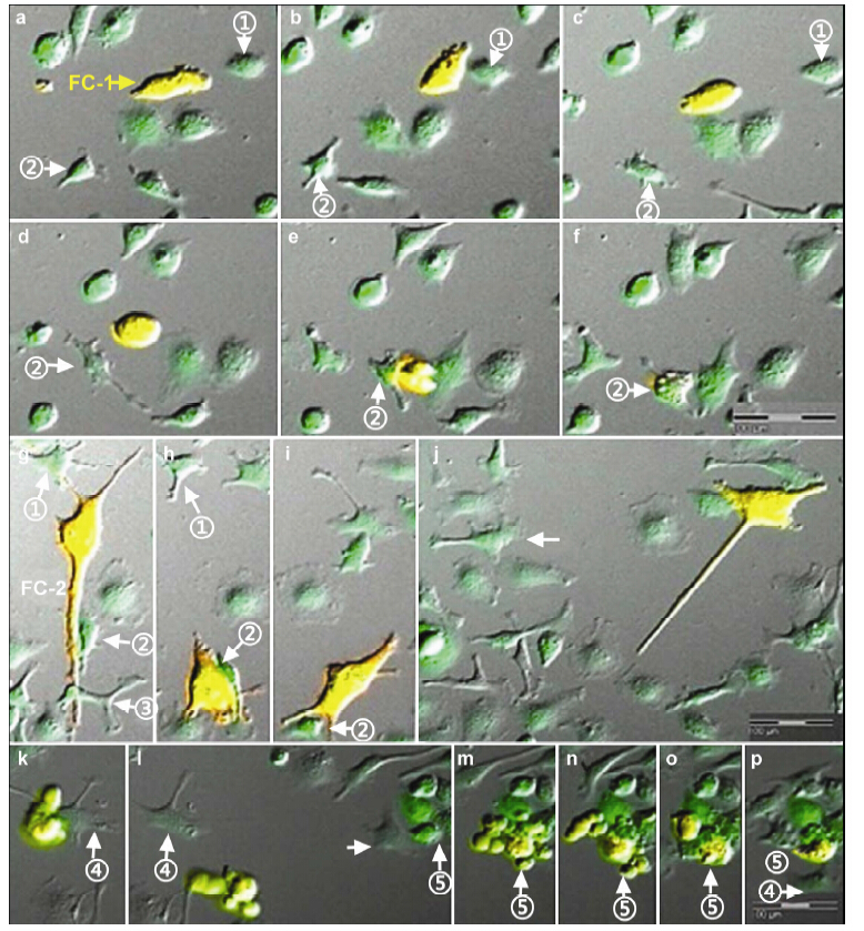| Figure 5 Instant apoptosis of fusion cells. One of the fusion cells, the FC-1 cell migrated irregularly before apoptosis. Initially, it moved close to the No. ① cell (a), but the cells were not in close contact. The migrating cell continued towards the left front and turned back (b). Next, the FC-1 cell approached to the No. ② cell (c), which extended its pseudopodia, stopped during migration (d) and moved close to the FC-1 cell (e). Nearly simultaneously, the FC-1 cell collapsed suddenly and its debris was engulfed by the No. ② cell (f). Another fusion cell, the FC-2 cell, migrated while showing continuous morphologic changes of its cell body. Initially, the cell contacted the surrounding No. ①–③ Mø cells (g). Only the No. ② cell followed the FC-2 cell closely (h), but they eventually separated (i). The No. ④ cell approached the FC-2 cell and extended its pseudopodia (j), after which the FC-2 broke into pieces (k), but phagocytosis did not occur. The FC-2 cell debris approached the No. ⑤ cell (l) gradually, and phagocytosis occurred in No. ⑤ (m–o), while No. ④ had no further changes (p). |