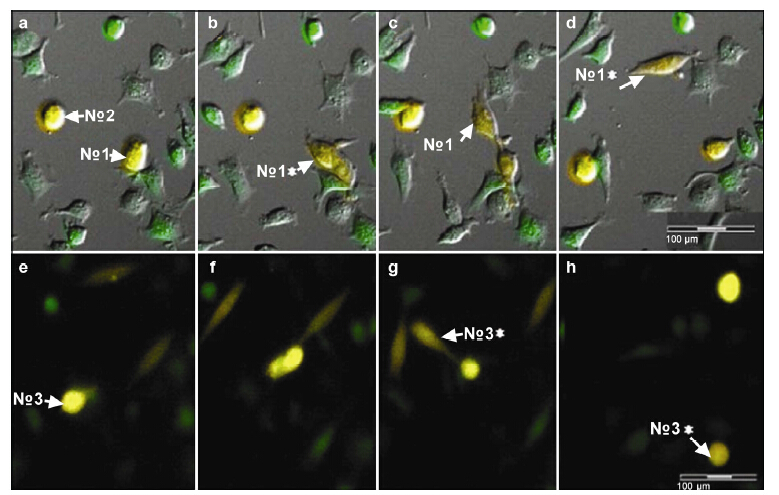 | Figure 7 Fate of entotic cells. Entosis occurred in two yellow spherocytes, No. 1 (a) and No. 3 (e). The deep yellow round cell No. 1 released a slight yellow short spindle cell (b, c), after which the offspring cells rapidly exited. During release, the shape of the parent cell changed from round to spindle. After release,the shape of the parent cell was restored to its original state (b: No. 1*; d: No. 1*). The No. 3 (e) parent cell migrated and stretched its small prominences in different directions (f), and then it retracted and released a long spindle pale yellow offspring (g: No. 3*). The offspring cell moved actively around its parent cell. After 370 min the cell became a spherocyte, similar to its parent cell (h: No. 3*). |