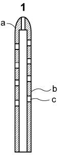 | Figure 1 Vertical view of the drainage tube. a. Bullet-like tip of the drainage tube. b. Tube wall. c. Opening hole. |