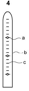 | Figure 4 Parts of the barrel of the drainage tube. a. Long line and dot marker indicating 5cm. b. Barrel wall. c. Scale of 1 cm marked with a short line. |