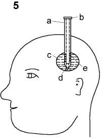| Figure 5 Placement of the drainage tube along with the plunger inside the hemorrhage area. a. Barrel of the drainage tube. b. Plunger rod at the back of the plunger. c. Hematoma cavity. d. Plunger head. e. Opening hole. |