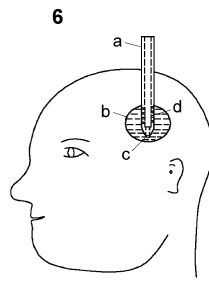 Figure 5 Placement of the drainage tube along with the plunger inside the hemorrhage area. a.Barrel of the drainage tube. b.Plunger rod at the back of the plunger. c. Hematoma cavity. d. Plunger head. e. Opening hole. Figure 6 The drainage tube after removal of the plunger from thehemorrhage area. a. Barrel. b. Hematoma cavity. c. Barrel head. d.Opening hole.