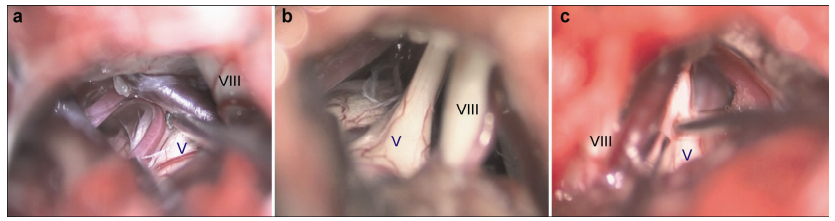 | Figure 1 Three group for trigeminal neuragia. (a) The trigeminal nerve was compressed by the artery. (b) The trigeminal nerve without compression needed rhizotomy. (c) The selective lesion was performed on the trigeminal nerve, after decompression. Ⅴ: the trigeminal nerve; Ⅷ: the auditory nerve. |