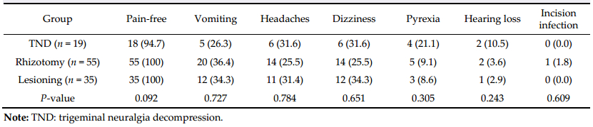 3 Results 3.1 Short-term surgical outcomes and complications (Table 1)During the hospitalization, 108 patients (99.1%) were completely pain-free and 1 patient (0.9%) had pain relief. There was also no facial paralysis, diplopia, or cerebrospinal fluid leakage. Data showed postopera-tive vomiting in 37 patients (33.9%), headaches in 31 patients (28.4%), dizziness in 32 patients (29.4%), pyrexia in 12 patients (11.0%), and incision infection in 1 patient (0.9%); however, all of these symptoms disappeared before patients left the hospital. Addition-ally, postoperative hearing loss occurred in 5 patients (4.6%); during follow-up, 4 patients had regained normal hearing while 1 patient still had hearing loss. Statistical analysis showed that different microsurgical methods had no effect on the occurrence of vomiting, headaches, dizziness, pyrexia, incision infections, and hearing loss (P > 0.05).