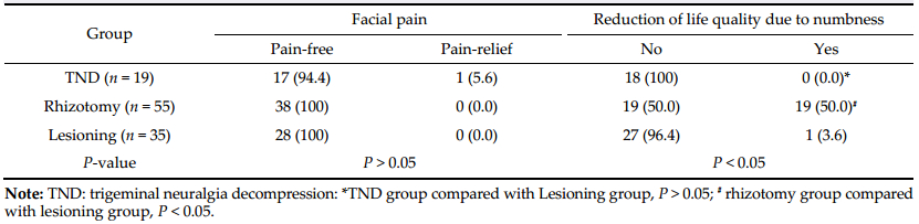 3.2 Mid-term outcomes and numbness (Table 2)Eighty-four patients were followed up through telephone interviews; the follow-up time ranged from 6 to 33 months, with a mean of 17.7 months. In the TND group, 27 of the 28 patients were completely pain-free, and no patient had symptoms of numbness. In the rhizotomy group, all patients were pain-free, but half of the patients thought their quality of life was reduced due to numbness. In the lesioning group, all patients were pain-free, while 1 patient out of 27 thought their quality of life was reduced due to numbness. Based on these statistics, the microsurgical