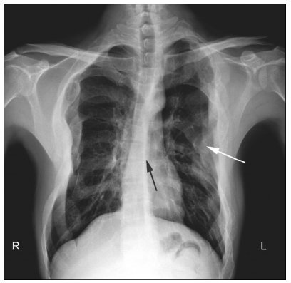 | Figure 2 X-ray chest analysis demonstrating scoliosis (black arrow) and multiple local enlargements of the ribs (white arrow). |