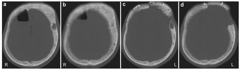 | Figure 3 A CT scan demonstrating a contoured bone and enlarged cranial cavity. (a, b) Before the fistula repair surgery. (c, d) After the fistula repair surgery. |
