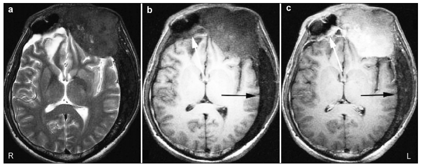 | Figure 4 Axial MRI demonstrating abnormal thickening of the bones in a patient with FD. (a) T2-weighted images show the involved skull bones are hypointense. (b, c) T1-weighted images show the involved skull bones are hypointense (b) with varying enhancement (c). Left frontal bone and the wall of the right frontal sinus showed evident enhancement (white arrows) while the left posterior skull bones did not (black arrows). |