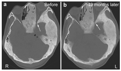 | Figure 5 (a, b) CT showing the left optic canal before and nineteen months after surgery (arrows). The compression of the left optic nerve was more severe at nineteen months after surgery (right) than before surgery (left). |