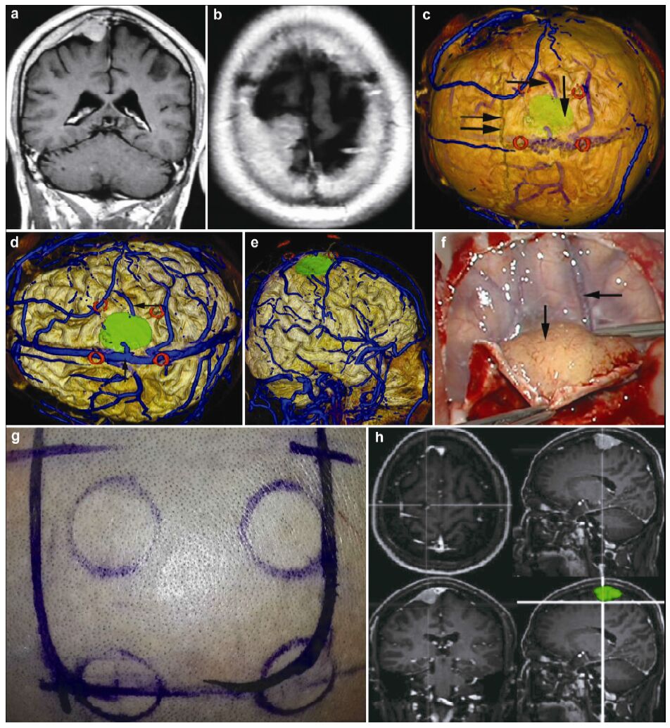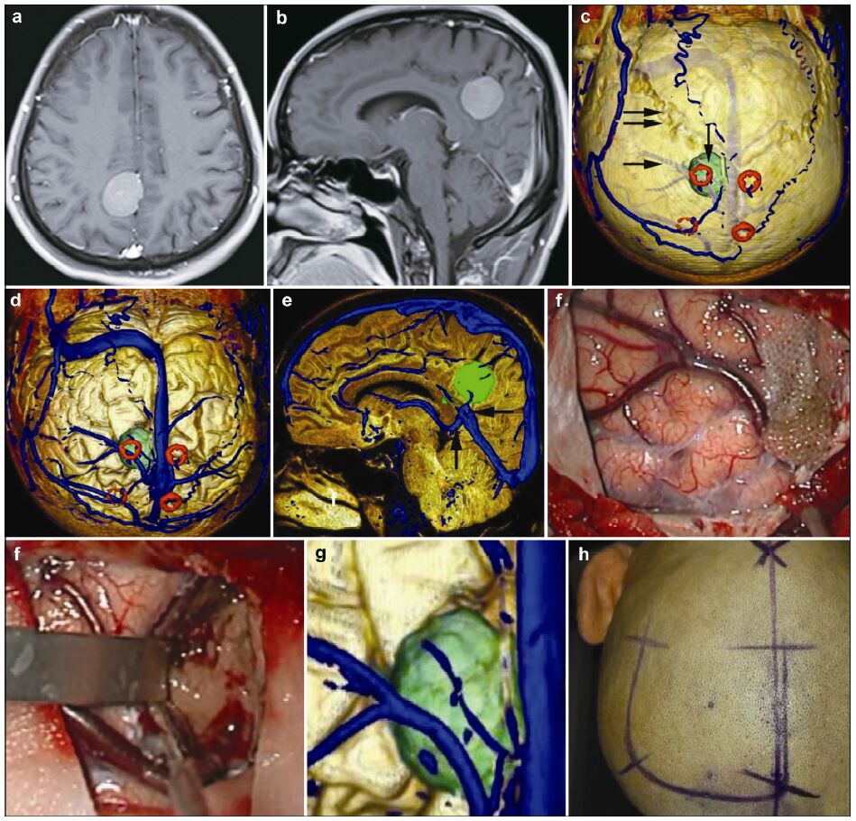 | Figure 6 Magnetic resonance imaging, reconstruction images, surgical incision, 3D view, and actual operative view in a 55-year-old male patient with a meningioma in right frontal lobe. (a, b) T1 enhancement scans: The tumor presented as homogenous enhancement. (c) 3D reconstruction (skull semitransparent): The tumor (vertical single arrow) located behind the coronary suture (horizontal double arrow) and adjacent to sagittal suture. The right central sulcus vein (horizontal single arrow) is under the tumor. (d) 3D reconstruction (do not show the skull): The tumor is adjacent to the superior sagittal sinus (vertical single arrow) and superior sagittal sinus (vertical single arrow). (e) 3D reconstruction (lateral view): The tumor is adjacent to the superior sagittal sinus and locates on the surface of the brain above the right central sulcus vein (horizontal single arrow). The markers are around the tumor. (f) Intraoperative situation: The intraoperative situation is consistent with 3D reconstruction images. (g) Surgical incision. (h) 3D view: The images of 3D reconstruction are consistent with that of T1 enhancement MRI. |