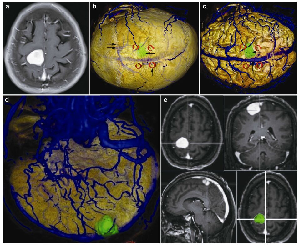 | Figure 2 Magnetic resonance imaging, reconstruction images, and 3D view of MRI in an 66-year-old female patient with a meningioma in right frontal lobe. (a) T1 enhancement scans: The tumor presented as homogenous enhancement and the precentral gyrus is located anterior to the tumor. (b) 3D reconstruction (skull semitransparent): The tumor (horizontal single arrow) located behind the coronary suture (horizontal double arrow) and the markers (vertical single arrow) are around the tumor. The superior sagittal sinus and superior cerebral veins are faintly visible. (c) 3D reconstruction (do not show the skull): The tumor (horizontal single arrow) is adjacent to the superior sagittal sinus (vertical single arrow). (d) 3D reconstruction (lateral view, brain tissue semitransparent): The tumor is adjacent to the superior sagittal sinus and locates on the surface of the brain. The positional relationship between the tumor and markers can be seen clearly. (e) 3D view: The images of 3D reconstruction are consistent with that of T1 enhancement MRI. |