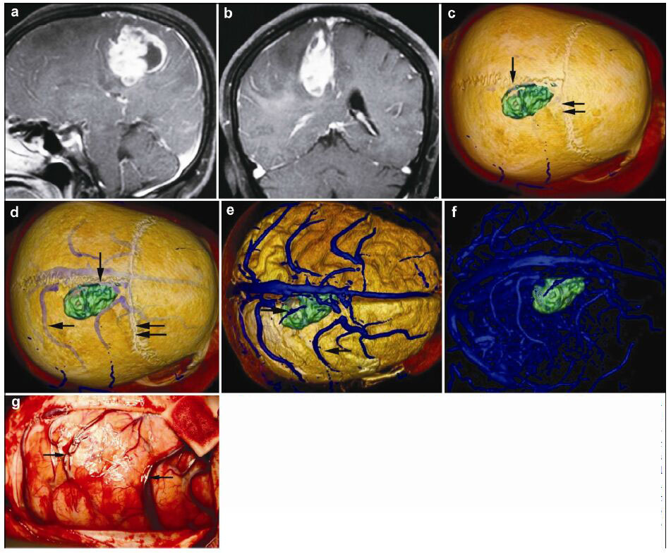 | Figure 3 Magnetic resonance imaging, reconstruction images, and actual operative view in a 62-year-old female patient with a malignant meningioma in right frontal lobe. (a, b) T1 enhancement scans: The tumor presented as heterogeneous enhancement. (c) 3D reconstruc-tion: The tumor located behind the coronary suture (horizontal double arrow) and adjacent to sagittal suture (vertical single arrow). (d)3D reconstruction (skull semitransparent): This picture not only shows the relationship between tumor and sutures (coronary suture, horizontal double arrow; sagittal suture, vertical single arrow) but also shows the relationship between tumor and the superior cerebral veins (horizontal double arrow). (e) 3D reconstruction (do not show the skull): The tumor locates between two superior cerebral veins (horizontal single arrow). (f) 3D reconstruction: This picture only shows the tumor and veins. (g) Intraoperative situation: The intraoperative situation is consistent with 3D reconstruction images. |