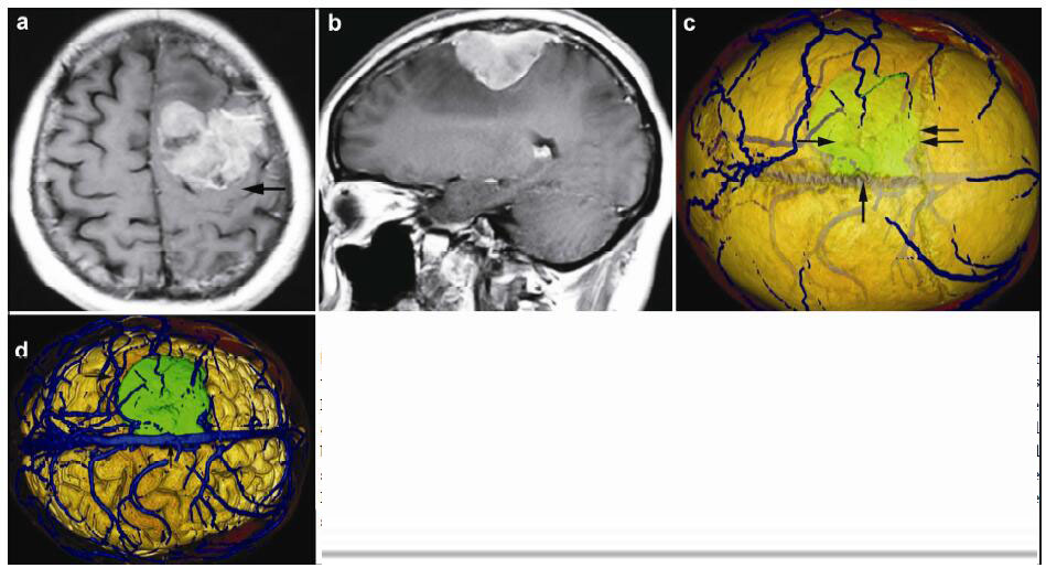 | Figure 4 Magnetic resonance imaging and reconstruction images in a 36-year-old female patient with a meningioma in left frontal lober. (a, b) T1 enhancement scans: The tumor presented as heterogeneous enhancement and locates anerior to left postcentral gyrus (horizontal single arrow). (c) 3D reconstruction (skull semitransparent): The tumor (horizontal single arrow) located behind the coronary suture (horizontal double arrow) and adjacent to sagittal suture (vertical single arrow). (d) 3D reconstruction (do not show the skull): The tumor locates anterior to the left postcentral gyrus (vertical single arrow) and the right side of the tumor is adjacent to the superior sagittal sinus (vertical single arrow). |