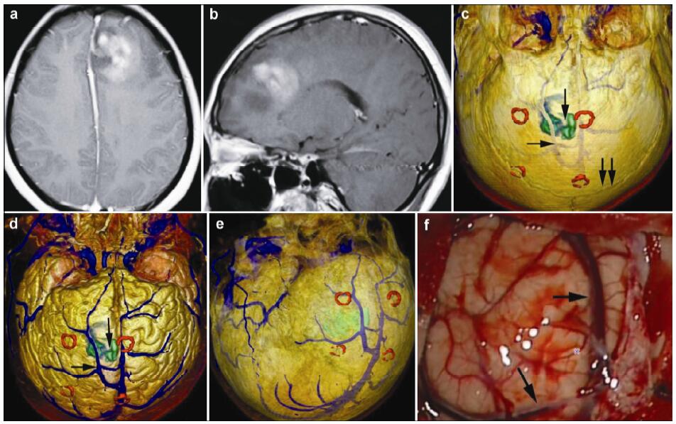 | Figure 5 Magnetic resonance imaging, reconstruction images, and actual operative view in a 24-year-old female patient with a glioblastoma in left frontal lobe. (a, b) T1 enhancement scans: The tumor presented as heterogeneous enhancement. (c) 3D reconstruction: 3D reconstruction (skull semitransparent): This picture not only shows the relatioshop between tumor and sutures (vertical double arrow) but also shows the relatioshop between tumor (vertical single arrow) and the superior cerebral veins (horizontal single arrow). (d) 3D reconstruction (do not show the skull): The superior cerebral veins are shown clearly and the tumor (vertical single arrow) is under one large superior cerebral vein (horizontal single arrow). (e) 3D reconstruction (superolateral view, skull, and brian tissue semitransparent): In this picture, we can see tumor, markers, superior cerebral veins, and brain tissue simultaneously. (f) Intraoperative situation: The intraoperative situation is consistent with 3D reconstruction images. |