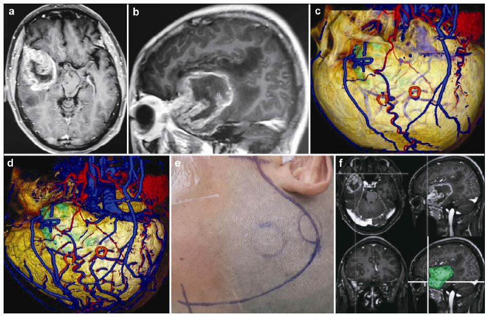 | Figure 7 Magnetic resonance imaging, reconstruction images, surgical incision, and 3D view in a 51-year-old male patient with a glioblastoma in right frontal lobe. (a, b) T1 enhancement scans: The tumor presented as heterogeneous enhancement. (c) 3D reconstruction (skull semitransparent): The scalp blood vessels have been shown clearly. The tumor and superior cerebral veins are faintly visible. (d) 3D reconstruction (lateral view, do not show the skull): The tumor located under the markers. The veins, arteris, brian surface, and markers have shown clearly and the tumor is faintly visible. (e) Surgical incision. (f) 3D views: The images of 3D reconstruction are consistent with that of T1 enhancement MRI. |