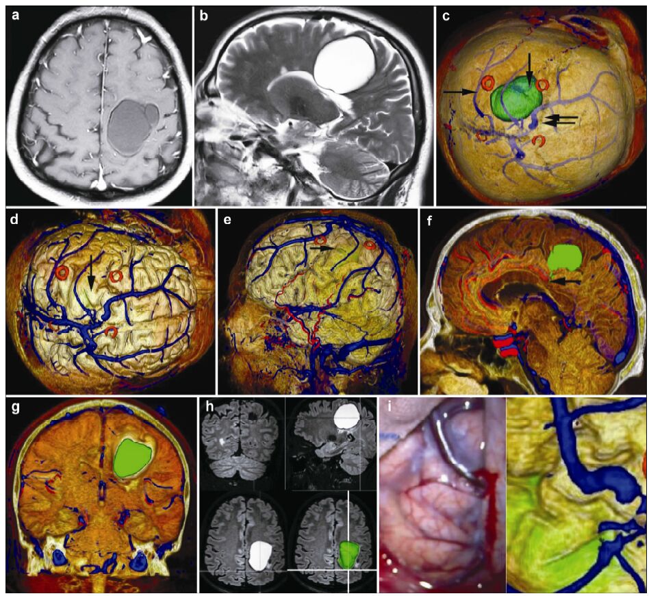 | Figure 8 Magnetic resonance imaging, reconstruction images, surgical incision, 3D view, and actual operative view in a 51-year-old male patient with a vascular malformation in right frontal lobe. (a, b) T1 enhancement scan: The cyst presented as no enhancement; (b) T2 scan: The cyst presented as high signal. (c) 3D reconstruction (skull semitransparent): The cyst (vertical single arrow) located behind the coronary suture (horizontal double arrow) and the markers are around the cyst. The superior sagittal sinus and superior cerebral veins (horizontal single arrow) are faintly visible. (d) 3D reconstruction (do not show the skull): The cyst (vertical single arrow) is faintly visible and locates anterior to one superior cerebral vein. The veins on the surface of the brain can be seen clearly. (e) 3D reconstruction (lateral view): The cyst (horizontal single arrow) is anterior to one superior cerebral vein and locates under the motor cortex. (f) Sagittal cutting: The corpus callosum (horizontal single arrow) is compressed by the cyst. (g) Coronay cutting: The lateral ventricle and corpus callosum are compressed by the cyst. (h) 3D view: The images of 3D reconstruction are consistent with that of flair MRI. (i) The comparison of intraoperative situation and 3D reconstruction: The intraoperative situation is consistent with 3D reconstruction images. |