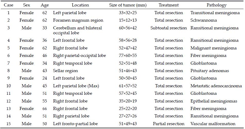 2 Methods 2.1 Basic data of patientsThis study collected 15 cases of brain tumors, 7 cases were male, 8 cases were female, aged 24 to 66 years old. 2 cases of fiber meningioma, 1 case of epithelial meningiomas, 4 cases of transitional meningioma, 1 case of malignant meningioma, 1 case of pituitary adenomas, 3 cases of glioblastoma, 1 case of metastatic tumor, 1 case of vascular malformation, and Schwan-noma in 1 case. Basic data are shown in Table 1.