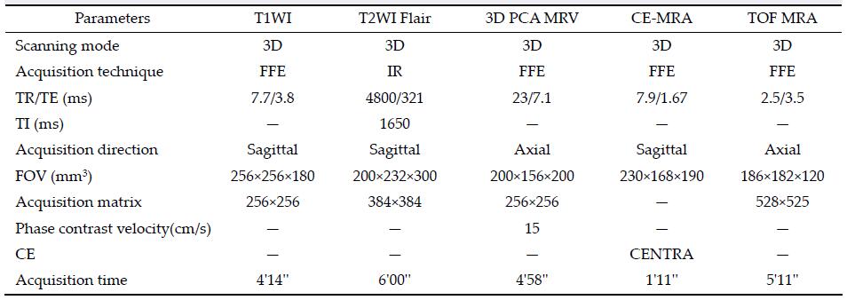 Each patient was underwent collection of CT, T1WI, T2WI Flair, 3D PCA MRV, CE-MRA, TOF MRA, and T1WI enhancement scanning. Specific imaging para-meters are shown in Table 2.