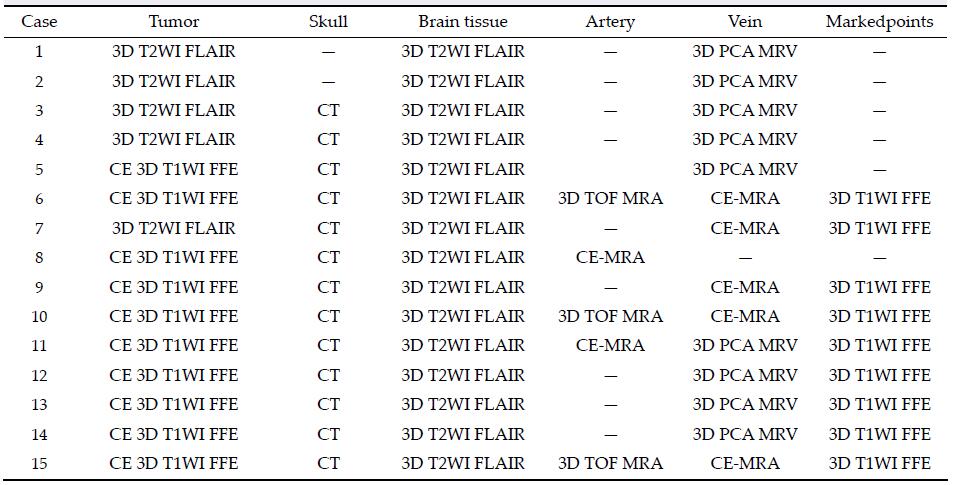 3D T2WI Flair data, marked points by 3D T1WI data. The veins and arteries has been reconstructed through 3D PCA MRV, CE MRA, or 3D TOF MRA data. Specific sources of fusion structures with each patient are shown in Table 3.