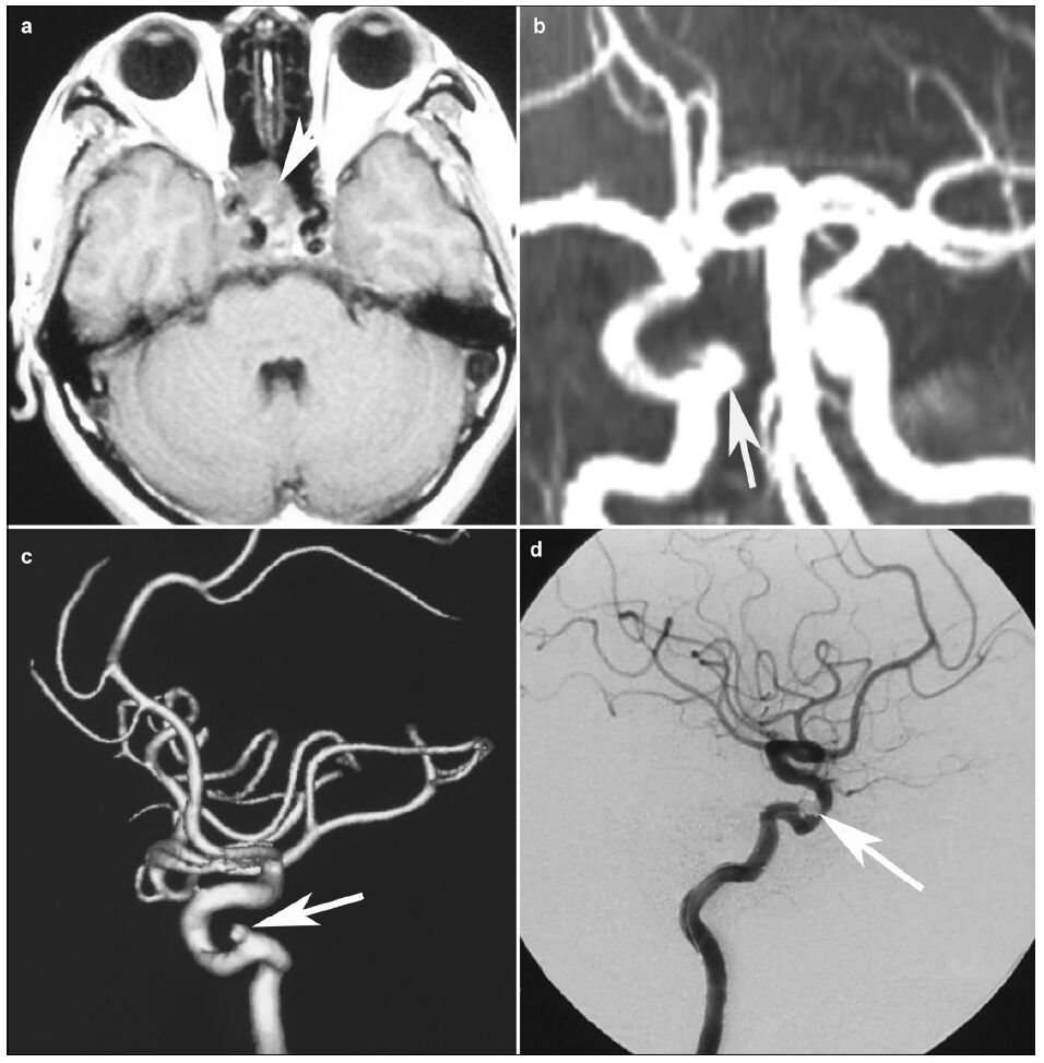 2 Case presentationPatient: male, 55 years old, suffered from sexual dysfunction for 2 years. Physical examination showed no positive signs. MRI showed a lesion located at the sellar area, and the tumor invaded the right cavernous sinus (Figure 1a). The serum prolactin was tested as 1, 600ng/ml (normal range, 1.39-24.2ng/ml). Prolac-tinoma was diagnosed. And he took bromocriptine for 3 times a day, with a dose of 2.5mg/time. One year later, cranial MR showed no evident changes in the tumor size, although the level of serum prolactin decreased to 46.3 ng/ml. He then took the gamma knife therapy to inhibit the growth of tumor. Four months after the gamma knife therapy, he got some clear liquid flowing out of the nasal cavity when bowing his head. The liquid was tested, showing Glu: 2.7mmol/L (range 2.5-4.5 mmol/L). Therefore, the patient was diagnosed with CSF rhinorrhea. After admission, he got the nasal bleeding. The blood amount was about 30ml, and the bleeding stopped thereafter. At first, the nasal bleeding was ignored. We chose endoscopic transnasal- sphenoidal approach to resect the tumor and repair the dura defect in the diaphragma sellae. The tumor apoplexy was not found during the operation. The dura defect was repaired, and the rhinorrhea stopped after the operation. However, he got another serious epistaxis 3 months after the operation. The bleeding was stopped with stuffing and compression. A suspi-cious aneurysm of right cavernous internal carotid was found in the MRA (Figure 1b), and the aneurysm was confirmed by the digital subtraction angiography DSA (Figure 1c). The endovascular coil embolization was performed to treat the aneurysm (Figure 1d). After the endovascular treatment, the patient was completely cured and discharged. During the follow-up of next two years, he recovered well and reported no new complaints.
